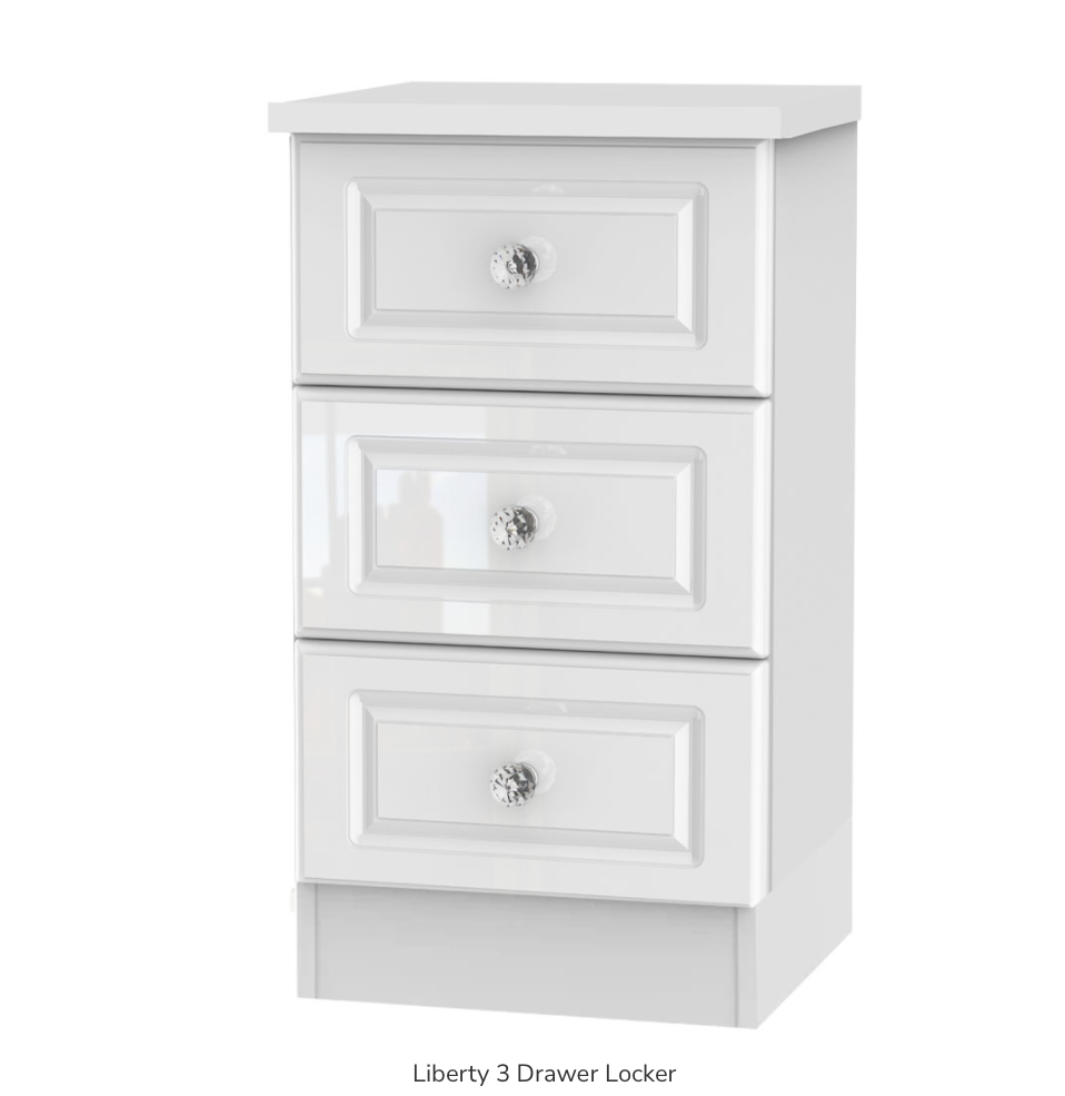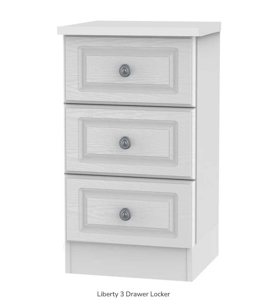 The Liberty 3 Drawer Locker is part of our Ready Assembled Liberty Bedroom Collection which is manufactured by Sleep Systems UK. This Bedroom Furniture Range is made right here in the UK and is factory assembled by our team of skilled workforce. Items in the Liberty Bedroom Collection include bedside cabinets, chest of drawers, dressing tables, wardrobes and bedroom accessories such as stool and mirrors. This collection can create wardrobe combinations to suit almost any bedroom from 2, 3 or 4 Door all the way through to 9, 10 or 11 doors... all wardrobes bolt together once in the desired room meaning any combination can be done with a mix of single robes, drawer robes and mirrored robes.