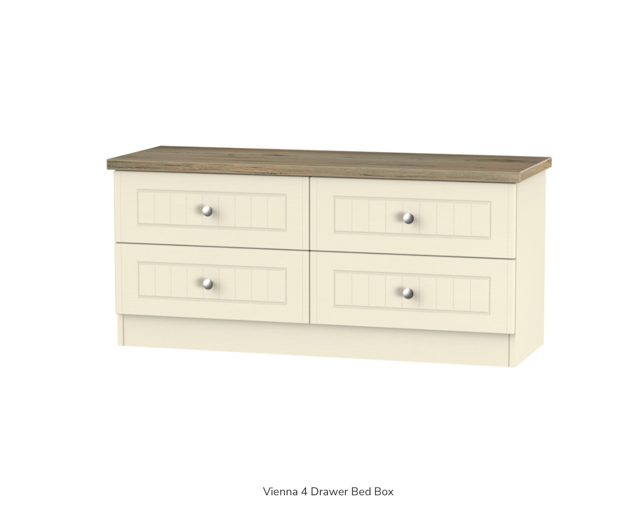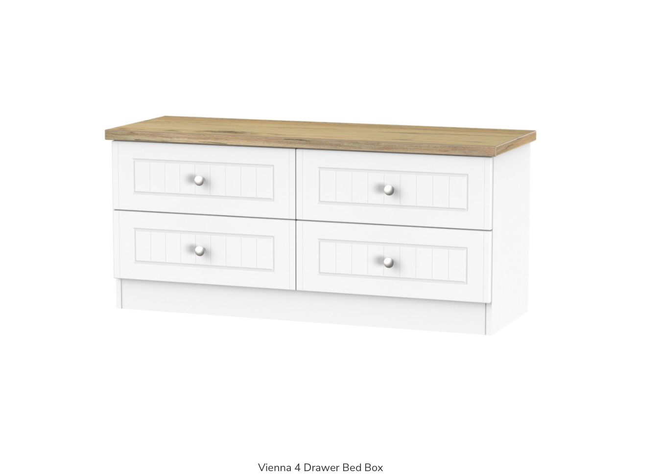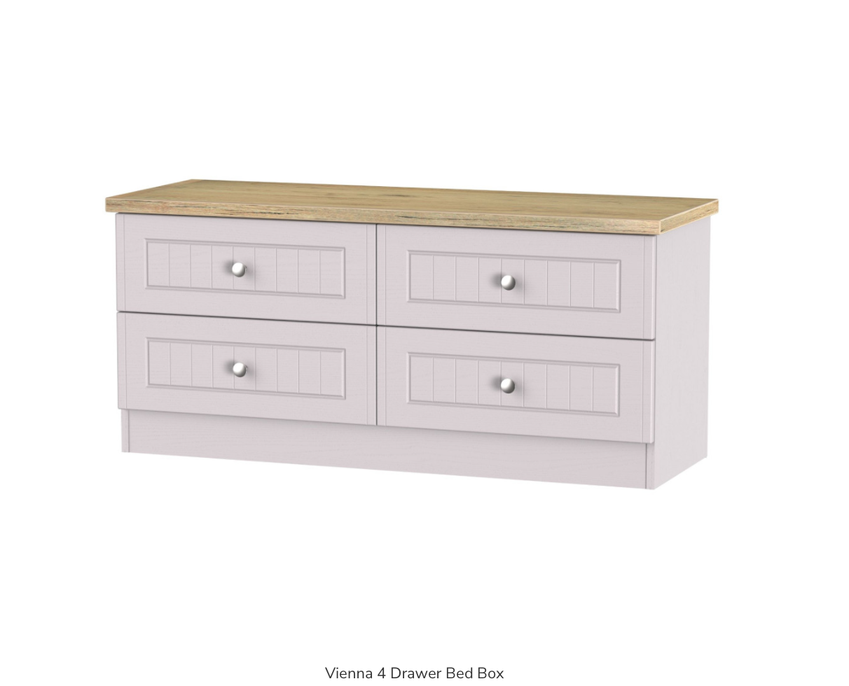 The Vienna Bedroom Furniture Collection is a traditionally designed range with a modern approach that will be ideal for any bedroom with both a classic and contemporary influence. Along with a 28mm Bordeaux Oak Top you have a choice of finishes for your base units. With quality, everlasting drawer runners, this piece has a linen effect on all drawer interiors, as well as a durable scratch resistant vinyl and stylish silver handles for added flair.